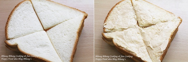 식빵 위에 슬라이스 치즈를 올리고 사진 처럼 썰어 주세요.맨 위에 커피를 넣어 만든 버터를 발라주신 다음,180도 오븐에 15분정도 구워 주시면 됩니다.