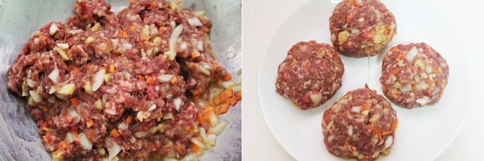 소고기를 다져 준 다음, 얇게 썰어 놓은 당근과 양파,마늘 후추,소금을 넣고 섞어주세요.섞어준 소고기와 야채를 사진 처럼 함박으로 동글하게 만들어서 준비 해 주세요^^