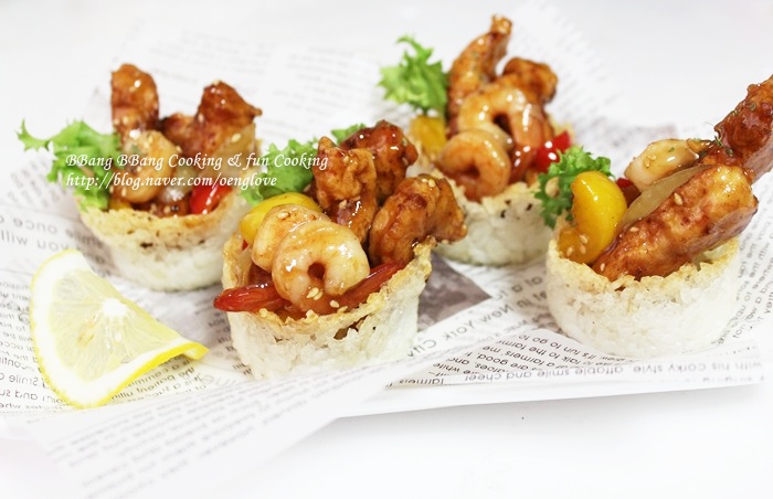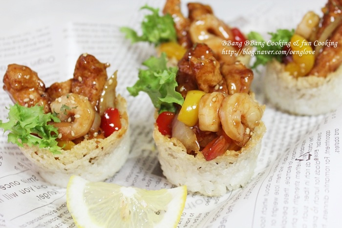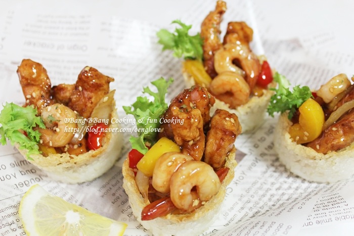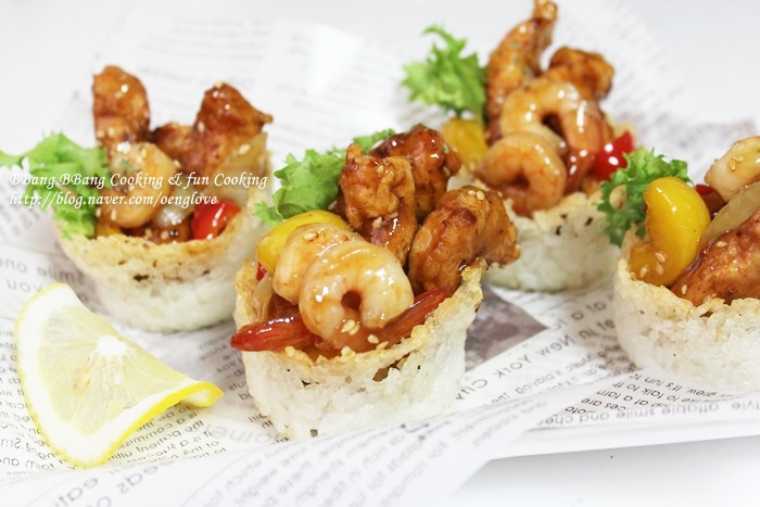 세상에..... 밥으로 그릇을 만들고 거기에 탕수육까지 새우 통통한게 비쥬얼 대박이고...정성이 가득들어간 음식이네요 ~ 침고여서 잘 보다갑니당