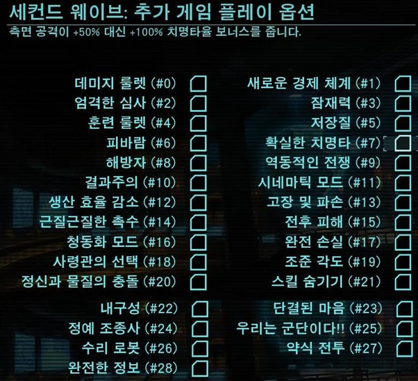 1.롱워를 시작하면 가장먼저 당황스런 부분이 세컨드 웨이브이다. 게임내의 여러가지 사항들을 미리 정해놓고 플레이 가능하다 라고 생각하면 되는데 이게 많은 부분 직접 플레이 해보기 전까진 무슨 말 하는 건지 알기가 쉽지 않다. 결국 게임내에서 부딫혀 보거나 미리 공부해야 뭘 키고 꺼야할 지 알 수 있다는 것. 이 부분에 팁을 주자면 처음 플레이 하는 사람이라면 일단 득이 되어보이는 옵션은 다 키도 해가 되보이는 옵션은 다 꺼놓고 시도하길 ‘권장’ 한다.