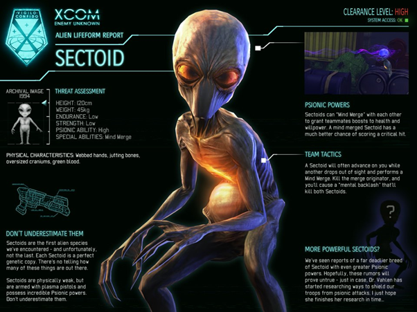 (꼬꼬마 섹토이드들이 분대단위로 정신공격을 해대고, 씬맨의 사격능력에 치가 떨리고, 사이버 디스크는 DR 수치로 무기테크가 받쳐주지 않으면 신병으론 1도 안들어가는 데미지에 좌절하게 될 것이며, 애지중지 키워놓은 병사가 크리살리드 알까기 한방에 요단강 건너실 때에는 내 뒷목도 함께 뻐근해 질것이다. 하지만 1-2시간씩 투자해가며 대형 UFO 라도 하나 성공적으로 털고나면 그렇게 뿌듯할 수가 없을 것이다.)