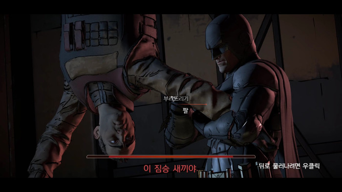 지금까지 응축된 배트맨의 화를 풀 곳이 없다. 본보기로 팔까지 그냥 부러뜨려버리자.
