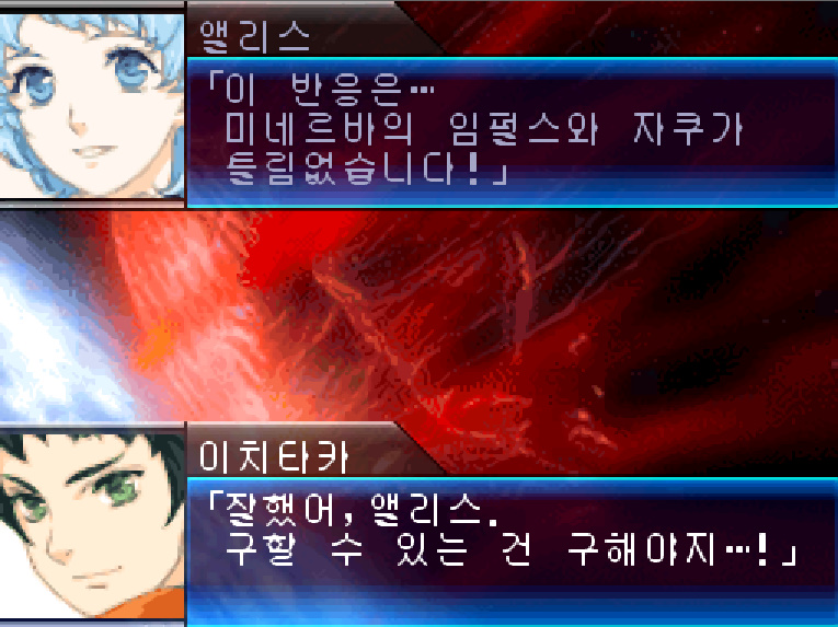 이치타카 : ...죄송합니다, 모리츠구씨. 전 미네르바 사람들을 구하고 싶어요. 잘못 본 걸지도 모르지만... 그런 상태로 대기권 돌입은 무리라고 생각합니다. 죽어버릴지도 모르는 사람을 그냥 두는 건 정의의 사도가 할 짓이 아니야.