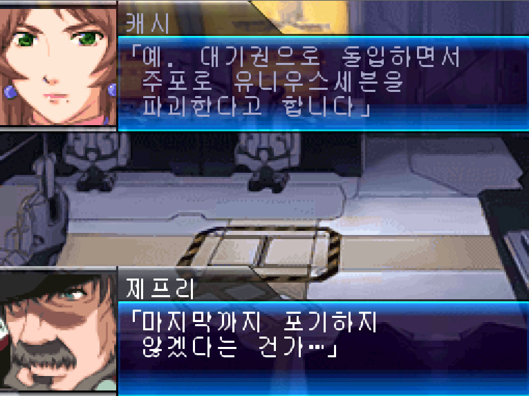 제프리 : 이 위치에서 마크로스 캐논을 쏘는 거다. 더 이상은 최대출력으로 쏠 수 없지만, 손가락 빨며 보고만 있는 것보다는 낫겠지.