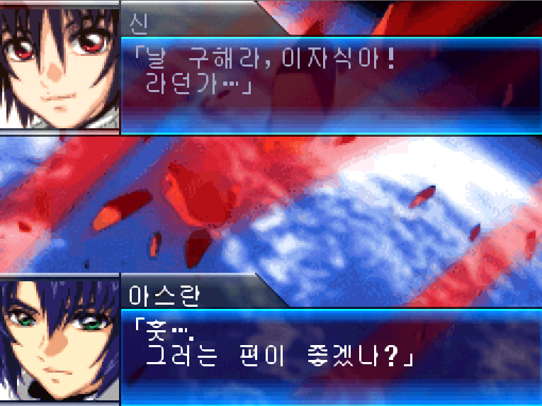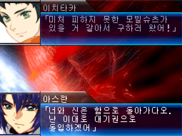 아스란 : 그래... 여기서부터는 각자가 자력으로 돌입할 수밖에 없어. 신, 넌 그 기체를 커버해라. 잘만 하면 둘 다 죽지 않을 거야.