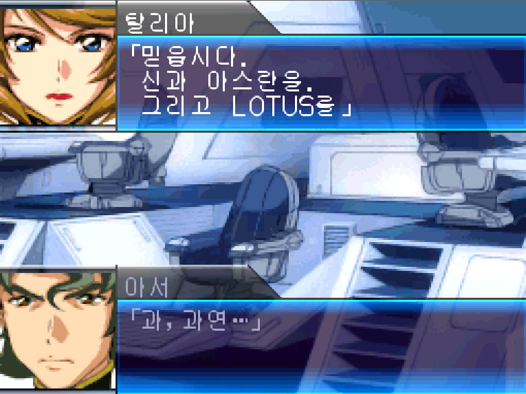 아스란 : 그랬나... 하지만, 그럴 필요는 없어. 너와 신은 함으로 돌아가다오. 난 이대로 대기권으로 돌입하겠어. 그게 나의... 이런 비극을 유발한 패트릭 자라의 아들 나름대로의 매듭짓기다.