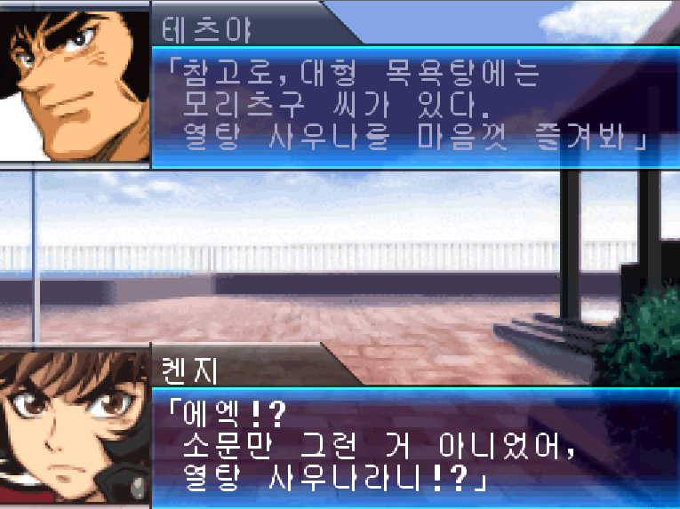테츠야 : ...불손한 생각을 하고 있었나 보군. 그러면 여성진은 개인실에서 샤워, 보스와 켄지만 대형 목욕탕을 사용해라. 참고로, 대형 목욕탕에는 모리츠구 씨가 있다. 열탕 사우나를 마음껏 즐겨봐.