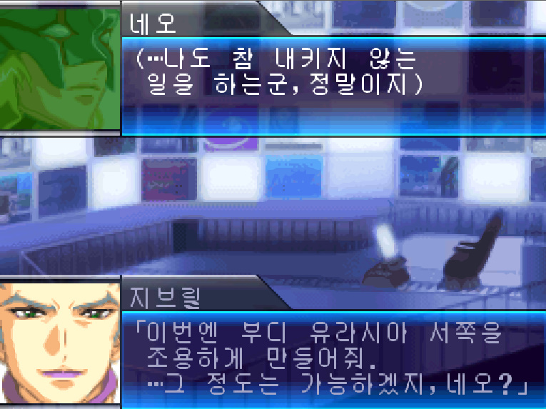 지브릴 : 그럼 다음 임무를 전하지. 며칠 전에 디스트로이가 완성되었는데. 자네에게 그걸 맡기기로 했다. 자네들이 미네르바를 쓰러트렸었다면 이런 작전은 필요 없었을 테지만, 별 수 없지... 그쪽에는 헤비암즈도 보내지. 파일럿은 뼛속까지 블루 코스모스에, 실력도 확실해. 이번에는 부디 유라시아 서쪽을 조용하게 만들어줘... 그 정도는 가능하겠지, 네오?
