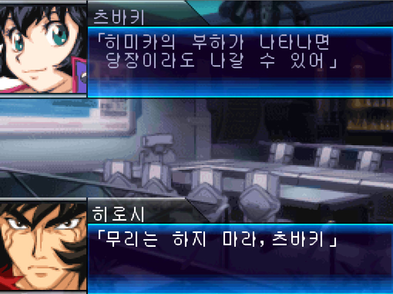 제프리 : 히미카의 행방에 관해서도 고우 켄타로 박사에게 협력을 청해볼 생각일세. 반응병기의 탑재 작업을 하는 동안, 각 파일럿은 교대로 반현휴식을 취하도록.