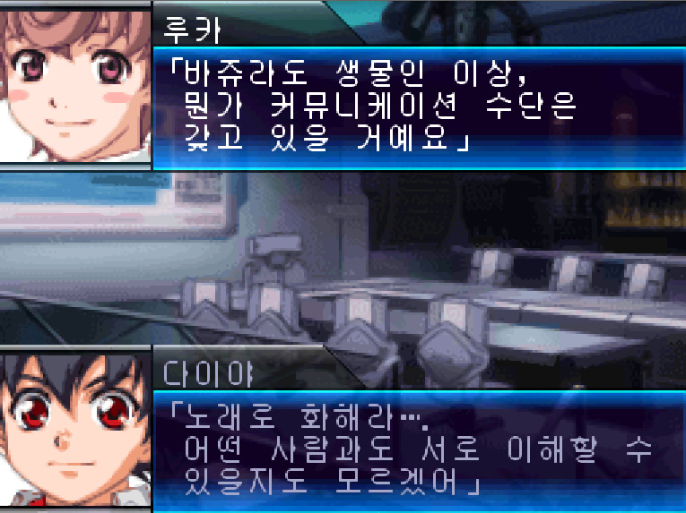 루카 : 바쥬라도 생물인 이상, 뭔가 커뮤니케이션 수단은 갖고있을 거예요. 이 실험이 성공하면, 바쥬라와의 전투가 쉬워지겠죠. 시험해볼 가치는 있을 겁니다.