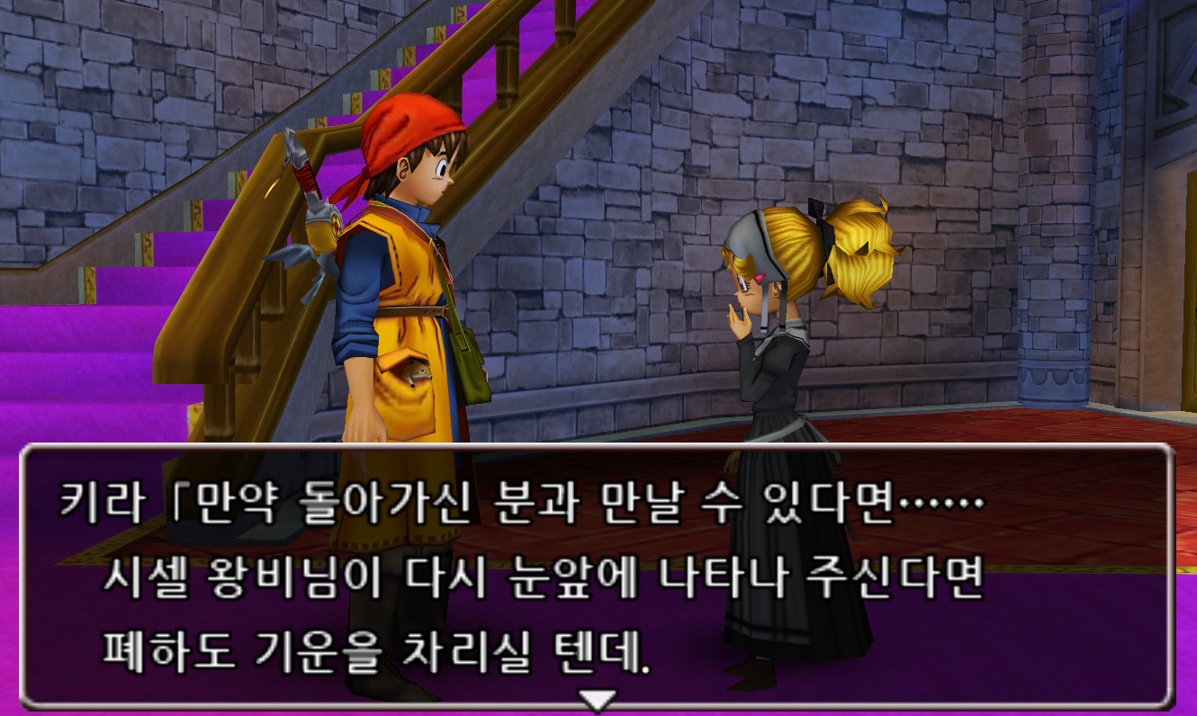 키라 : ...앗! 혹시 옥좌의 방에서 폐하를 만나 뵈셨는지요!? 여행자님, 저희 아스칸타 왕께서는 지금은 그 누구의 말도 듣지 않으십니다. 부디 무례를 용서해 주세요. 맞습니다. 시셀은 2년 전에 돌아가신 왕비님의 존함입니다. 만약 돌아가신 분과 만날 수 있다면... 시셀 왕비님이 다시 눈앞에 나타나 주신다면 폐하도 기운을 차리실 텐데... 그러고 보니 저희 할머니께서 옛날에 이야기를 많이 들려주셨어요. 신기한 이야기를 잔뜩. 그중에 어떤 소원이든 이루어지는 방법이 있다고 들은 것 같은데... 뭐였더라. 생각이 나질 않네요. 할머니를 만나고 오면 쉽게 알 수 있을 텐데, 저는 성에서 해야 할 일이... 여행자님, 부탁이 있습니다. 이 성 서쪽의 다리 근처에 사는 저희 할머니에게 가서 소원을 이뤄준다는 그 옛날 이야기를 자세히 듣고 와 주세요. 그냥 동화에 불과할지라도 만약 그게 진짜라면 저는 폐하의 소원을 이루어 드리고 싶어요. 제가 직접 가고 싶지만 저에겐 성에서 할 일이 있습니다. 마음대로 나갈 수는 없어요. 저희 할머니의 집은 이 아스칸타의 서쪽에 있는 다리 근처에요. 부디, 이렇게 부탁드립니다. 저는 폐하가 기운을 차리시도록 성당에서 기도하고 있겠습니다. 여행자님, 제발 부탁드립니다...