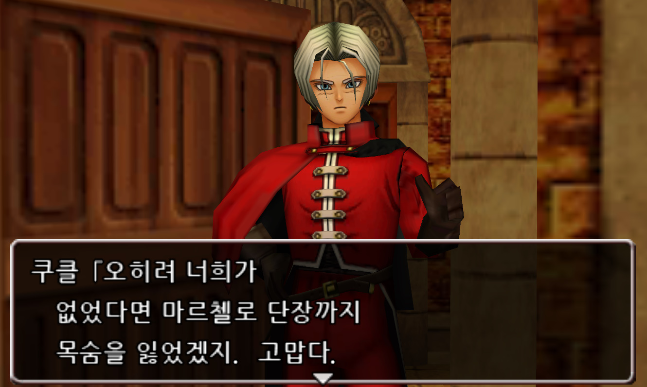 마르첼로 : ...와 주셨군요. 잠은 좀 주무셨습니까? 여기 계신 분께 이야기는 모두 들었습니다. 당치 않은 의심을 해서 죄송합니다. 증오스러운 도르마게스. 그 광대 녀석에게는 신의 이름으로 철퇴를 내려야 마땅합니다. 하지만... 저는 새로운 원장으로서 모두를 이끌어야 할 사명을 지고 있지요... 그래서 드리는 말씀입니다만, 여기 계신 트로데라는 분의 말씀을 들어 보니 여러분도 도르마게스를 쫓고 계신다면서요? 이러면 어떨까요? 여기 있는 제 동생 쿠클을 동행으로 받아 주시면 안 되겠습니까?