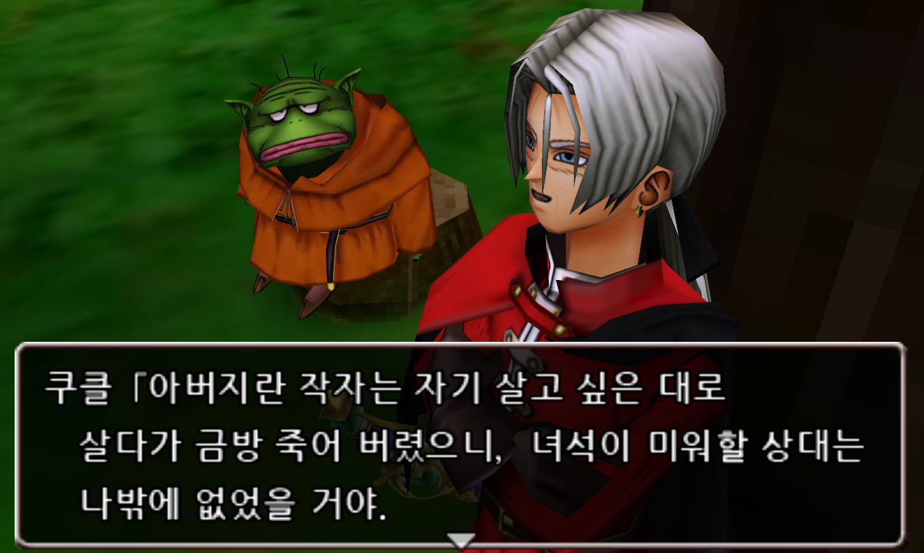 쿠클 : 내가 그걸 알았을 턱이 없잖아? 어리고 순진했던 소년 쿠클의 마음은 지독하게 다치고 말았지. 하지만... 생각해 보면 말이야. 아버지란 작자는 자기 살고 싶은 대로 살다가 금방 죽어 버렸으니, 녀석이 미워할 상대는 나밖에 없었을 거야... 뭐 이해는 가. 그 심정도. 그래서 좋은 기회였다고 생각해. 그녀석이 옆에 있으면 더 짜증이 날 테니까. 마침 마이엘라 수도원에서의 갑갑한 생활에도 넌덜머리가 났던 참이었고.