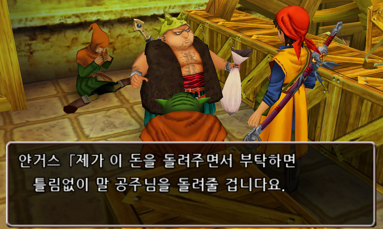 얀거스 : 이제 좀 마음이 놓이는군요. 방금 얘기한 암상인이라는 자는 사실 저랑 아는 사이걸랑요. 제가 이 돈을 돌려주면서 부탁하면 틀림없이 말 공주님을 돌려줄 겁니다요.