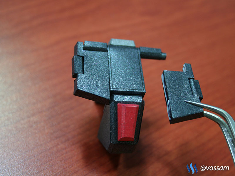 이건 앞 스커트 인데요. 위쪽에 작은 관?으로 삐져나온 부분을 끼워 넣어 가동이 가능하도록 되어 있습니다. 다만, 부품이 작아서 힘을 받기가 좀 힘들어요. 나중엔 접착을 하기도 하고, 저런 부분은 보강 하기도 합니다.