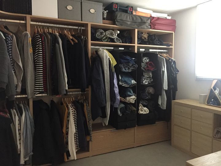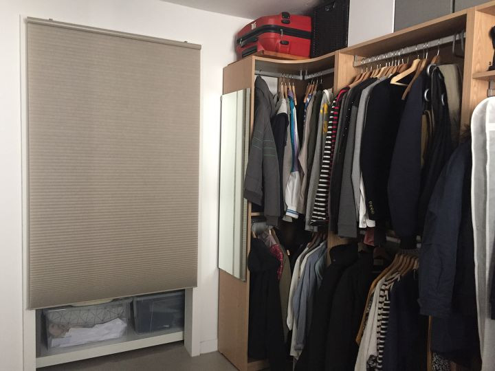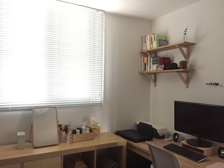 붙박이장 문을 철거하고, 배관 박스를 석고보드로 막고, 그위에 도장을 하고, 앵글장과 천장에는 행거를 설치하여 수납을 하고, 벌집 블라인드를 설치하여 공기를 순환케 만들었습니다. 부피를 많이 차지하는 문이 달린 옷장들보다는 시스템 옷장을 설치하였고, 싱글 시절에 세로로 사용하던 선반장을 가로로 눕혀 문과 서랍을 달아 장으로 활용하고 있습니다. 방에서 사용하는 컴퓨터 책상 역시 거실 테이블 제작 시 같이 애쉬집성목으로 제작한 책상입니다.