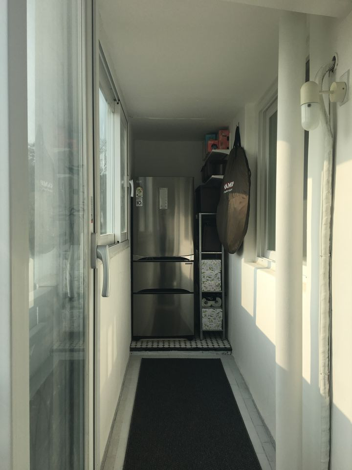 베란다 역시 문제 많은 붙박이장을 철거하고, 그 자리에 미장과 도장을 한 다음 타일 시공을 하였고, 김치냉장고를 배치하였습니다. 오른편 남는 공간에는 선반장과 선반들을 설치하여 수납력을 높여놓았구요.
