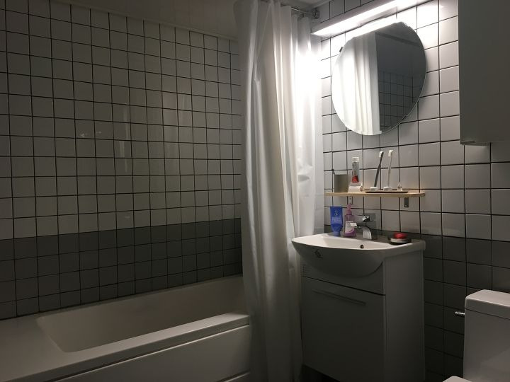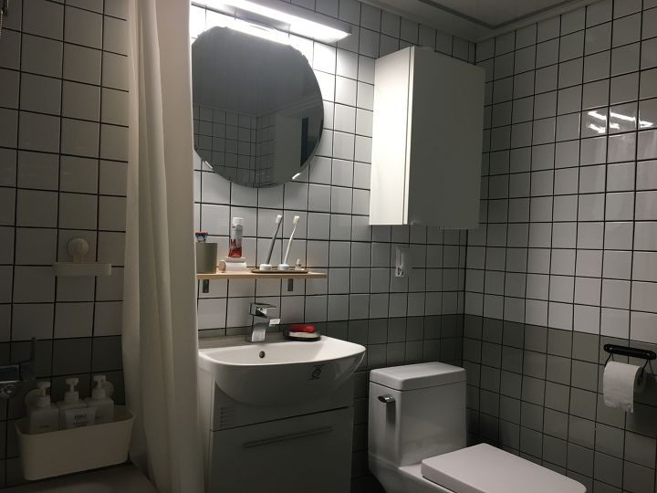 많은 분들이 이쁘다고 칭찬해주시는 곳인데요^^ 주방에서 사용한 백의백 유광 화이트 타일을 그레이색과 조합을 이뤄 투톤으로 시공하였구요. 바닥은 검은 무광 모자이크 타일에 회색 매지를 넣었습니다. 기존 욕실에는 샤워만 됐었지만, 욕조도 시공을 하여 피곤할 땐 반신욕도 자주 하고 있습니다!