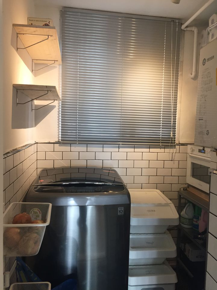 다용도실은 타일을 덧방으로 시공하였구요. 스프러스 원목으로 만든 선반과 기성품 선반대들을 시공하여, 최대한 수납력을 높이고, 전기오븐, 세탁기를 배치해두었습니다.