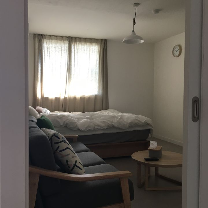 플로어 스탠드 조명, 커튼 : 이케아 / 침대, 소파 : 까사미아 / 소파테이블 : 셀프제작 / 벽시계 : 자연주의 / AV장 : 무인양품