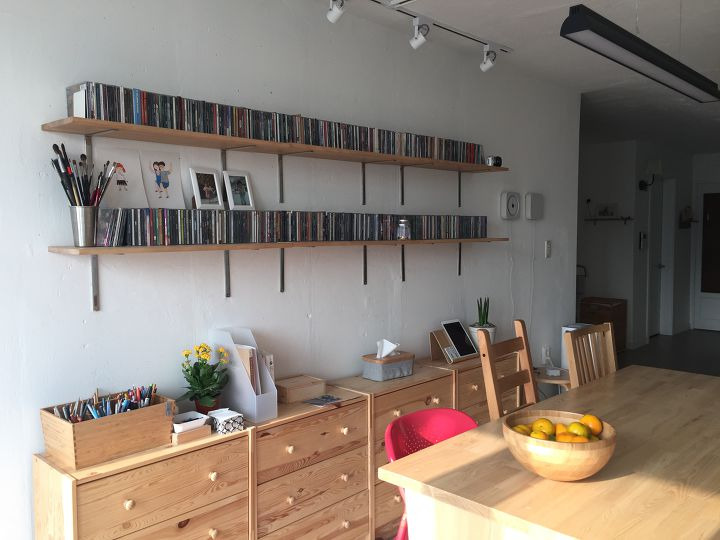거실은 대부분의 집들처럼 소파와 티비장을 배치시킬까 고민을 하다가 폭이 좁은 저희 집 거실의 단점을 이용해 북카페 형식으로 긴 테이블을 제작해 배치시키고 한쪽면에는 시디들을 수납할 수 있는 애쉬 선반과, 그 아래에는 수납장들을 배치했습니다. 음악을 좋아해 블루투스 스피커와 시디플레이어 세팅을 해놓았고, 공기청정기도 세팅을 해놓았습니다.