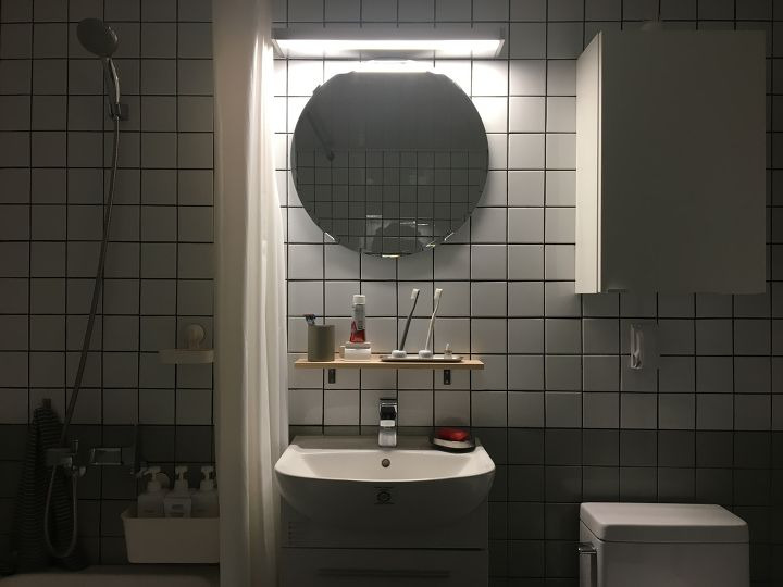 조명, 샤워커튼, 라탄바구니, 수건걸이, 휴지걸이, 원형거울, 선반장, 비누받침대, 욕실욕품 선반대 : 이케아 / 선반 : 셀프제작 / 청소기 : 플러스마이너스제로 / 욕실용품디스펜서 : 무인양품