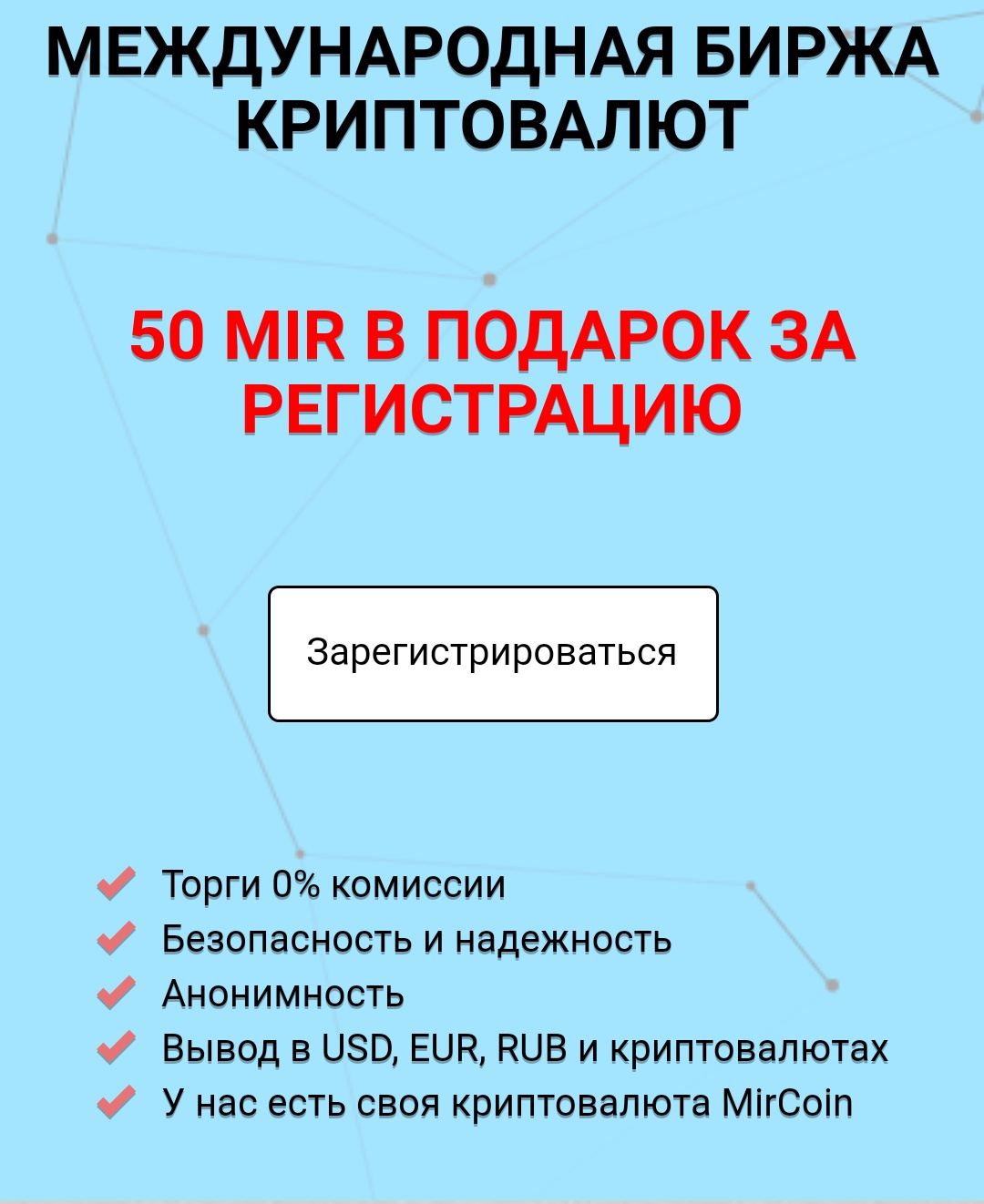Разместите обьявление о бирже и токене MirCoin на тематических площадках,сайтах, форумах, блогах, социальных сетях и получите 100 MIR.