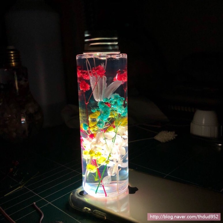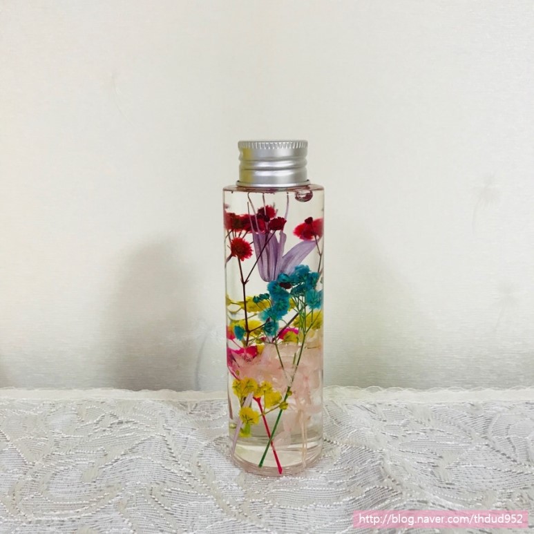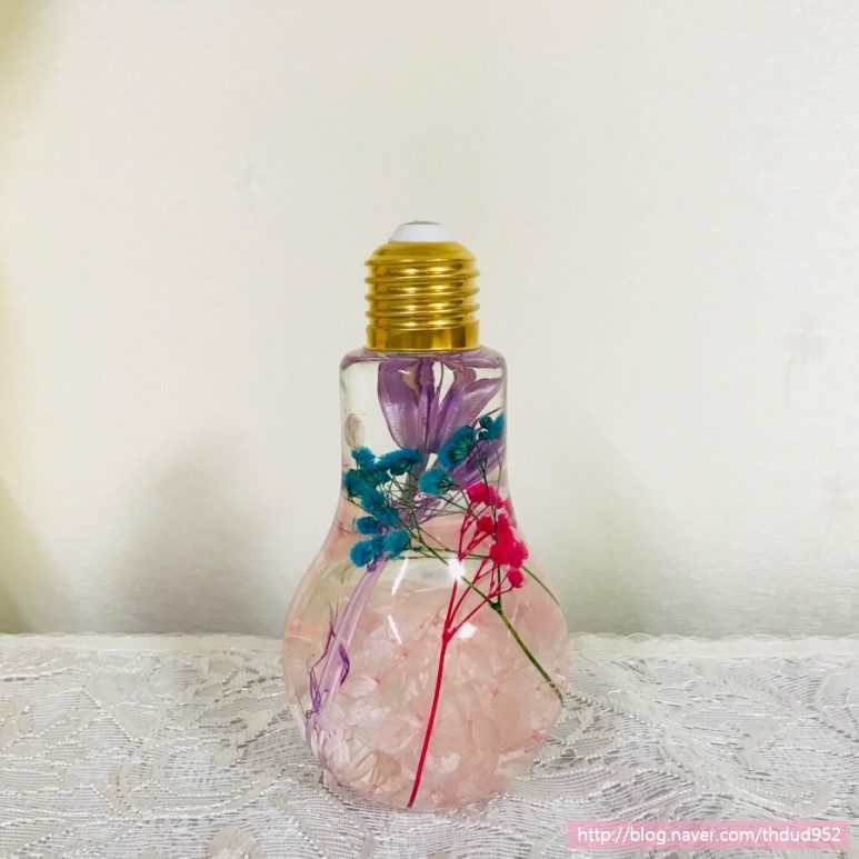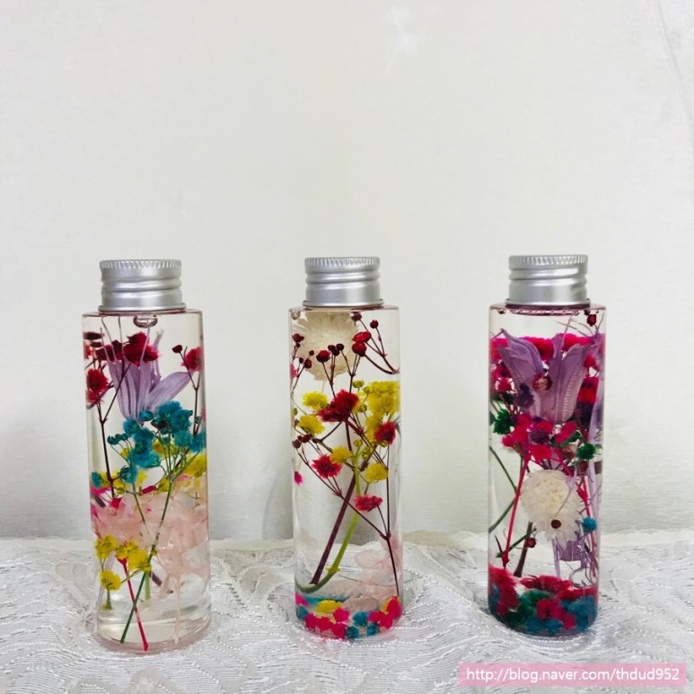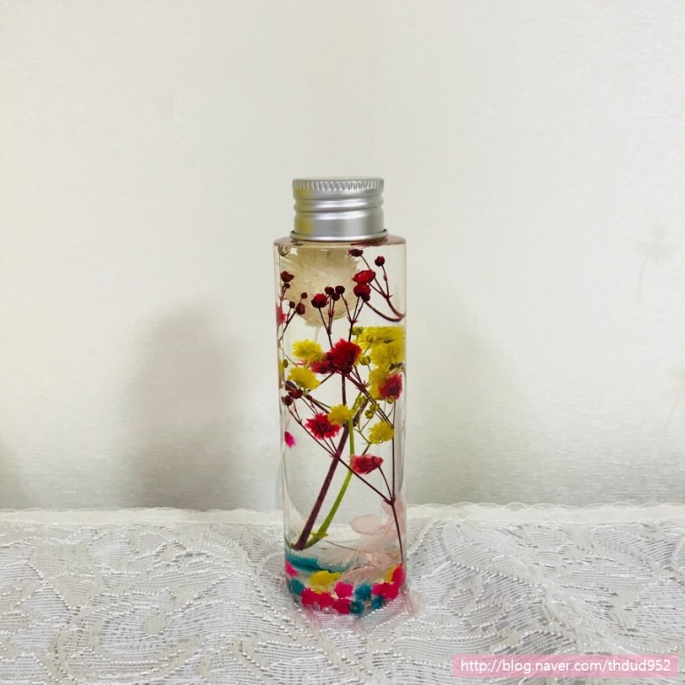 여기서 팁은 다른 만드신 분들은 꽃을 조금조금씩 넣고 용액을 중간중간 넣으셨는데,