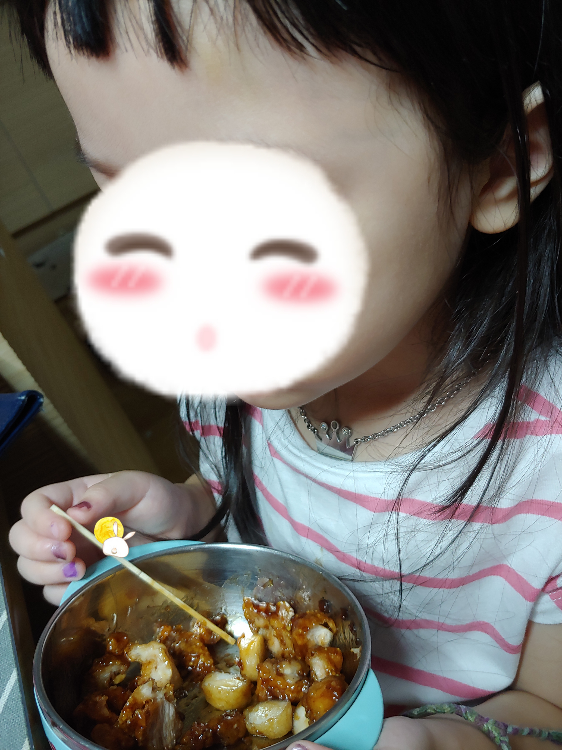 딸이 먹기좋게 닭강정도 자르고, 떡도 잘라주고 먹기 시작하는데 딸이 진짜 잘먹네요!!!