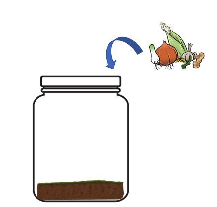 1. 병 밑에 흙을 깔아 주고요, 그 위에 집에서 나온음식물 쓰레기를 젖은것과 마른것을 잘 섞어서 넣어줍니다.(물로 헹궈서 염분을 제거해야하고, 물기가 많은 과일 껍질 종류는 살짝 말려서 넣어서 주는것이 좋음)
