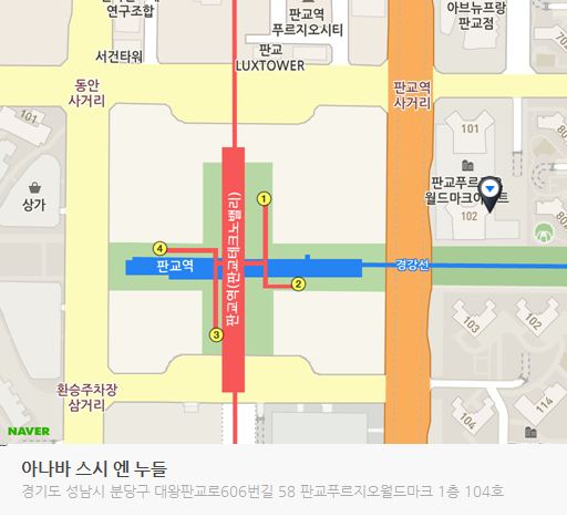 판교 현대백화점에서 5분정도 걸어가면 나오는판교 푸르지오월드마크 건물 뒤편에 자리잡고 있습니다.