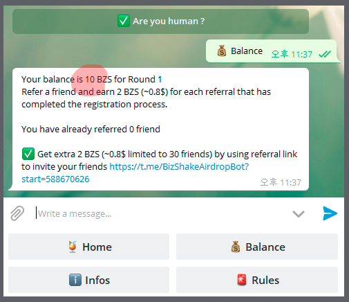 이제 Balance 밸런스 버튼을 클릭하시면 위와 같이 비즈쉐이크 코인 10개 받으신 것을 확인하실 수 있습니다