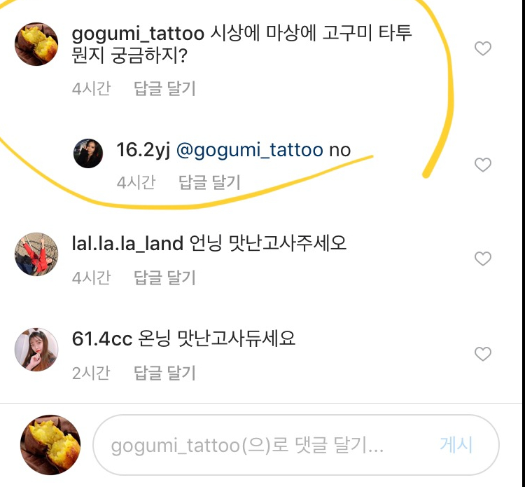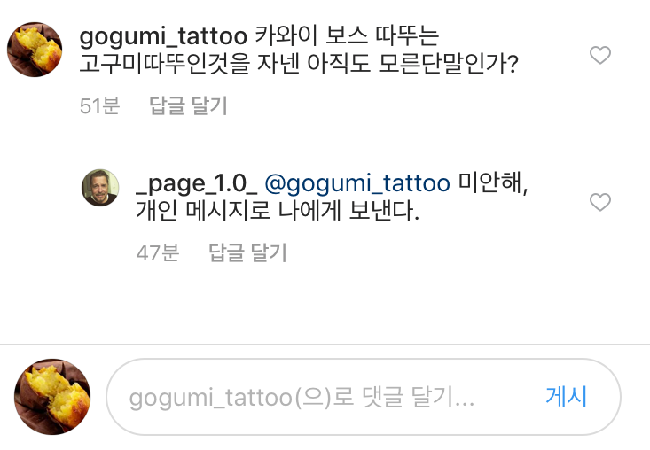 으아 댓글 너무웃겨요 >< 시상에 마상에 고구미 타투가 저도 궁금하네요 ㅋㅋ팔로우하고 봇팅하고갑니다^^