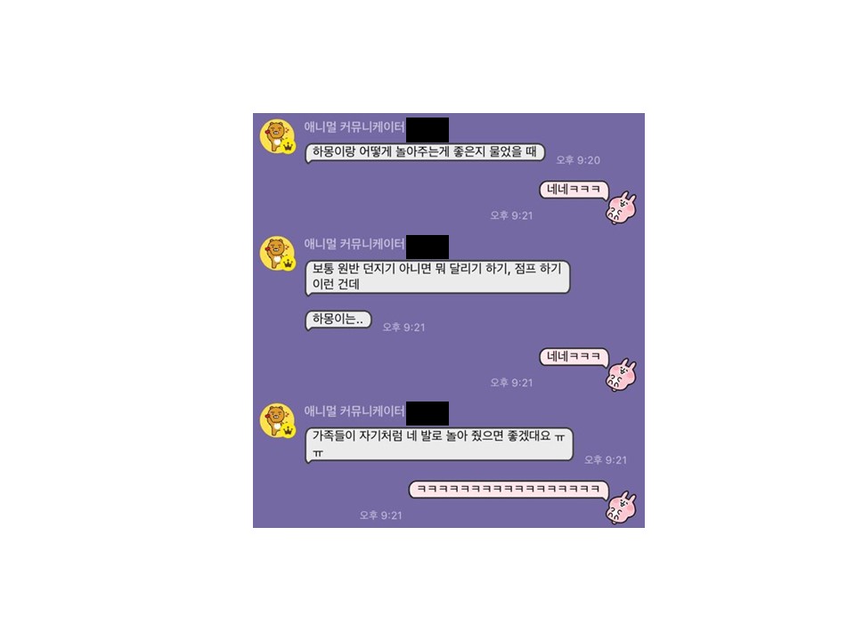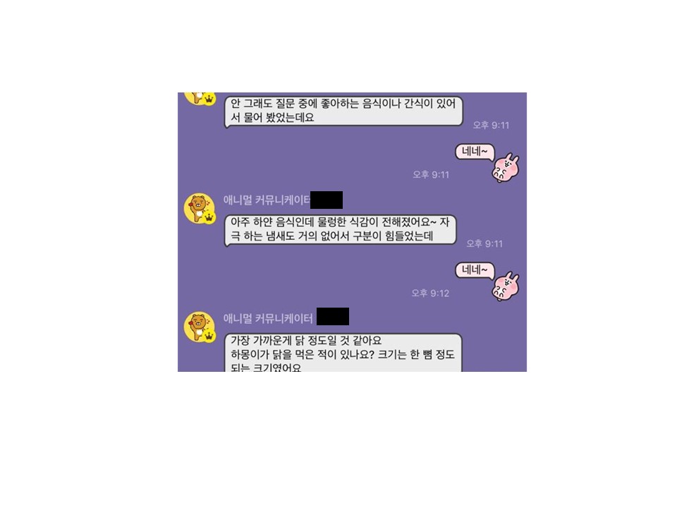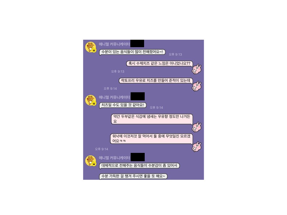 -> 이 질문은 평소에 잘먹는 간식 몇 가지를 머리 속에 생각해놓고 물어본 질문이에요. 머릿속으로 딱 닭가슴살이랑 치즈를 생각하고 있었는데 하얗고 수분이 많은 간식이라고 콕 찝어 말해주시더라고요! 재미로 본 것이긴 했지만 이 부분은 신기했답니다ㅋㅋㅋㅋ 커뮤니케이터분이랑 대화가 끝나고 바로 닭가슴살을 줬던 기억이 나네요 : )