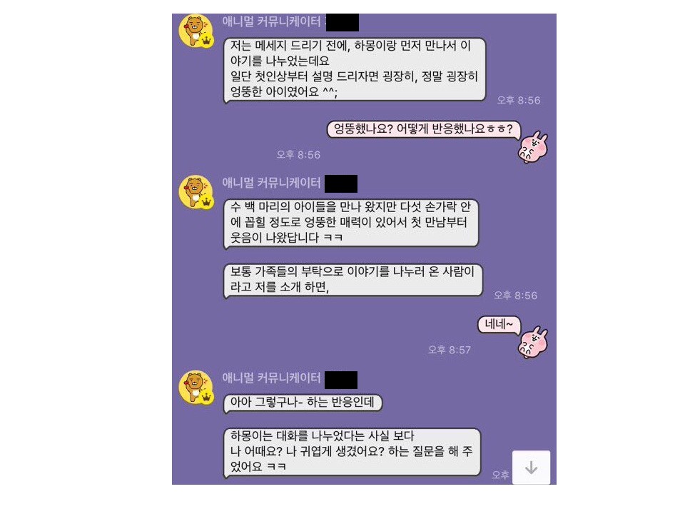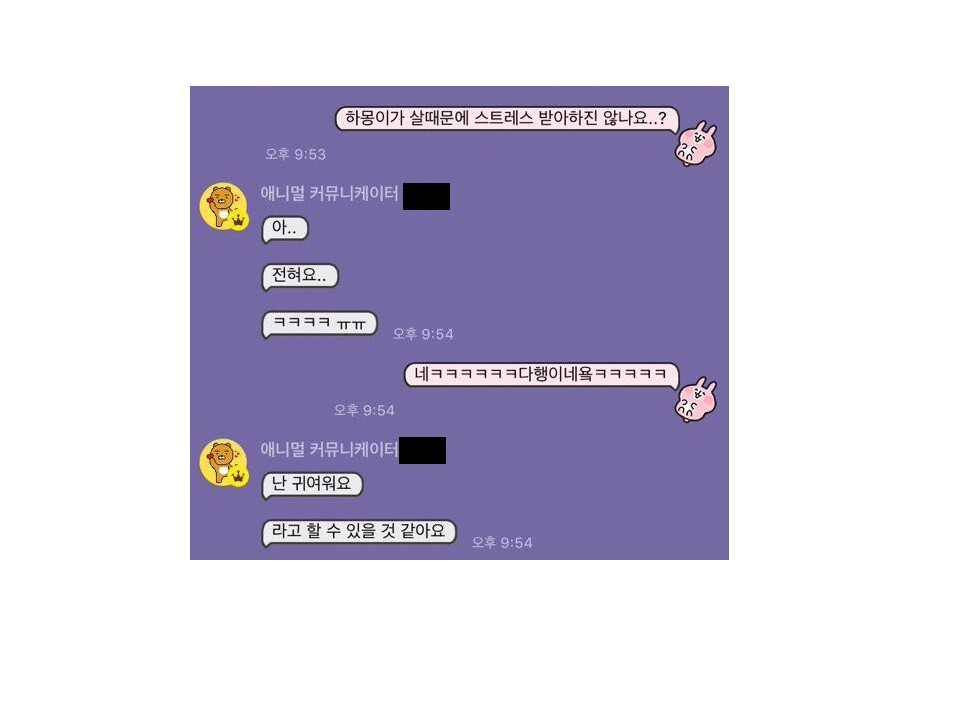 하이디 동물농장에 나온거 봤었는데 우리나라에도 활동하는 분들이 있군요. 애니멀커뮤니케이션을 받아보시다니 하몽이에 대한 사랑이 느껴집니다. 하몽이의 대답도 귀엽네요..ㅋㅋ