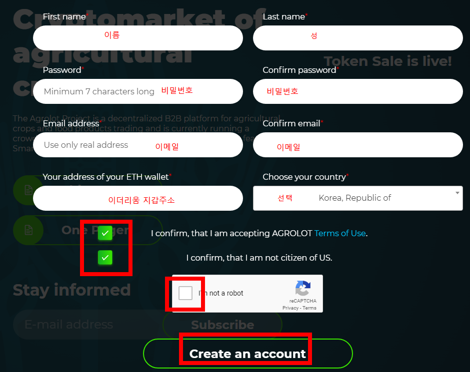 1-2) 이름 ,성 비밀번호 ,이메일 , 이더리움 지갑 주소 , Korea Republic 선택