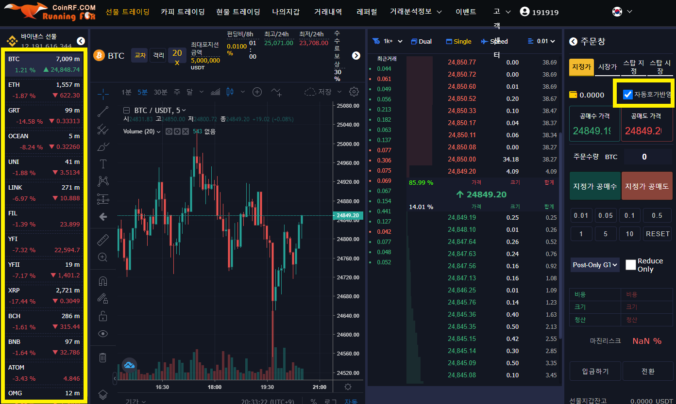 바이낸스보다도 더욱 편한 UI 기능과 [자동호가반영] 시스템이 이용가능합니다.
