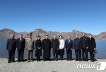20일 오전 문재인 대통령과 김정은 국무위원장이 백두산 천지에서 북측 수행원들과 함께 기념촬영을 하고 있다. 2018.9.20/뉴… ⊙뉴스1
