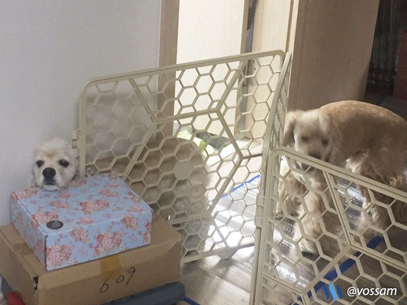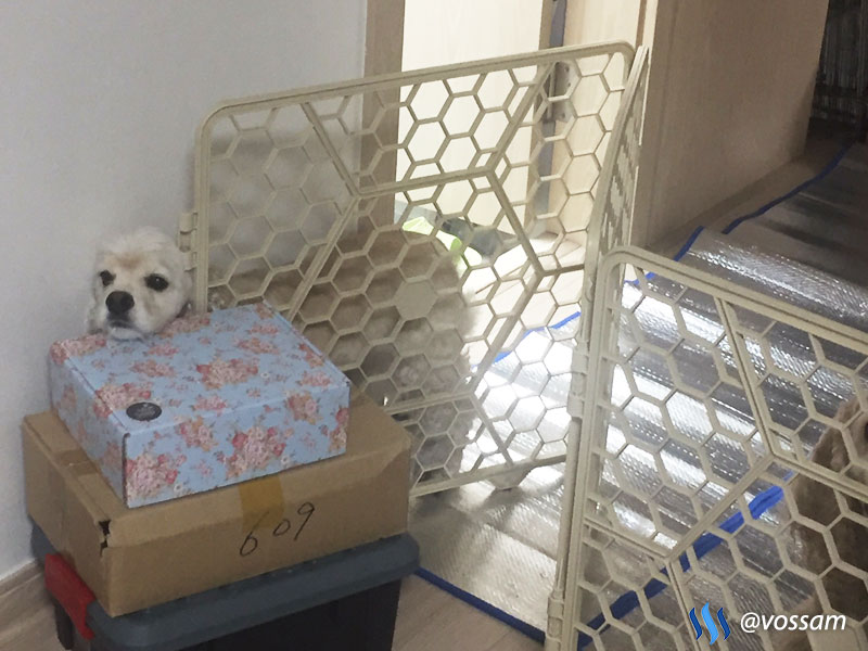 짐 정리를 하는데 하도 이리저리 쫒아 다니고 방해를 해서 울타리를 치고 거실에 있던 차에, 뒷통수에 싸해서 돌아 보니!!