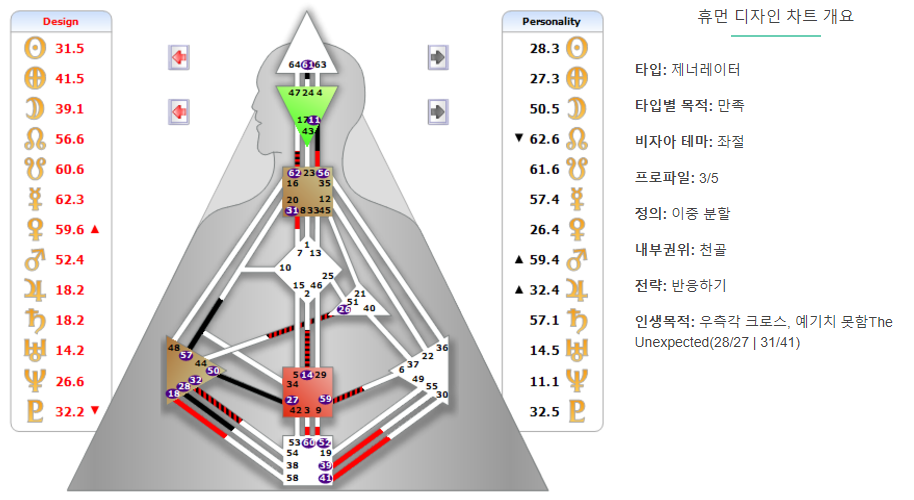 차트의 우측의 '검은 색(personality)'영역은 의식적으로 접근 가능한 영역(의식)을 뜻하며, 좌측 '빨간색(design)' 영역은 타인은 인식할 수 있으나 스스로는 인식할 수 없는 영역(무의식)을 의미합니다. 휴먼 디자인은 인류 최초로 '무의식'의 작동 메커니즘을 설명해 줍니다.