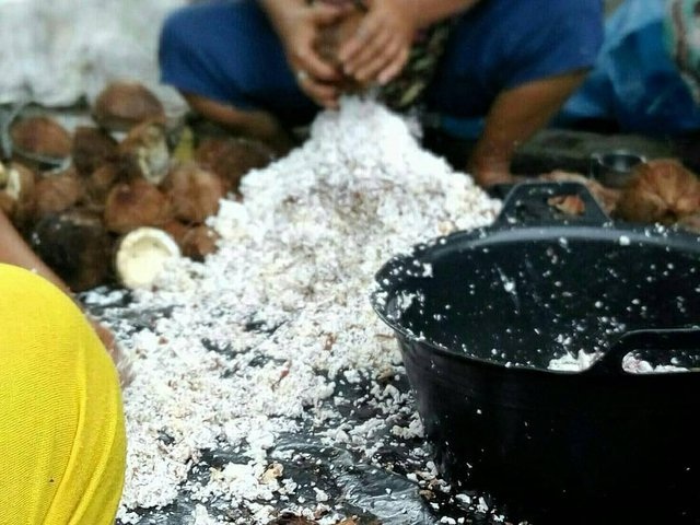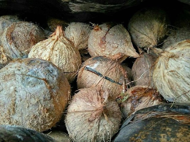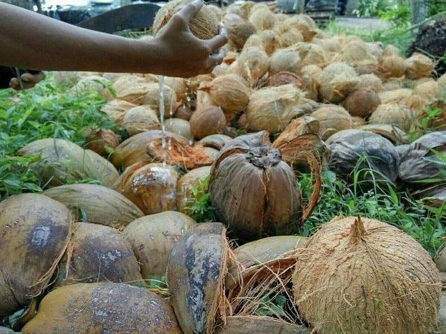 Take some old coconuts, then peel the old coconut husk thoroughly. After the coconut husk is clean then the coconut shell is split open to remove the water in the old coconut, then after all the old coconut shells are split, the old coconut is fermented for 3 days to proceed to the next stage. after the fermentation process, it is time to measure the coconuts.