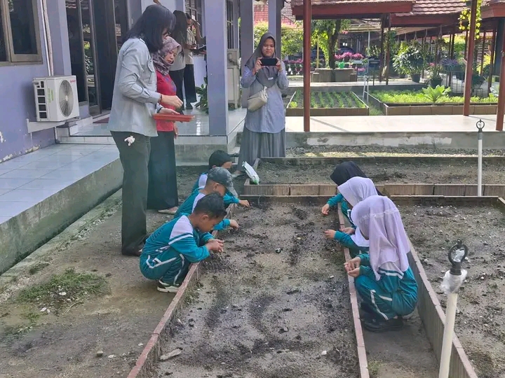 Siswa dikenalkan dengan cara becocoktanam sayuran di pekarangan dengan mempraktikkan cara menanam kangkung di bedengan, melihat sistim budidaya sayuran dengan hidroponik dan juga melihat koleksi tanaman buah di dalam pot (tabulampot).