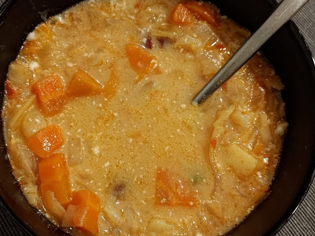 **크리미하게 마무리하기: 코코넛 밀크(또는 크림)를 넣고 저어준 후 소금과 후추로 간을 맞춥니다. 수프를 5분간 더 데워줍니다.