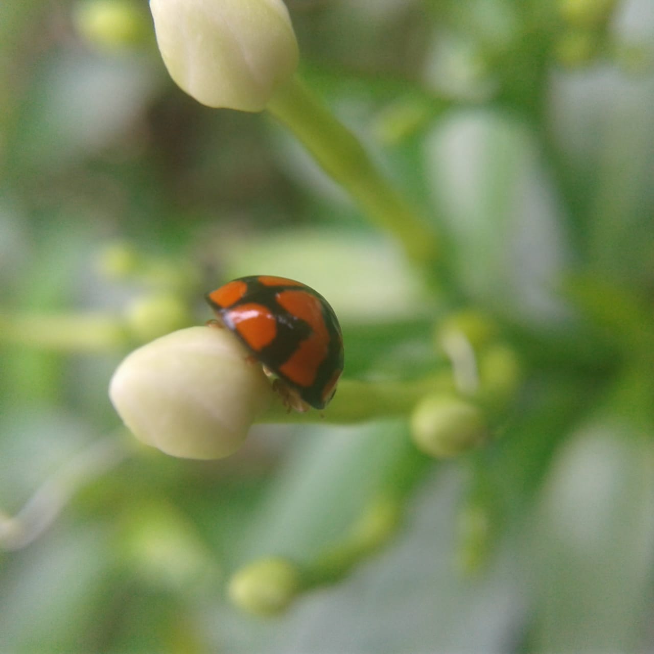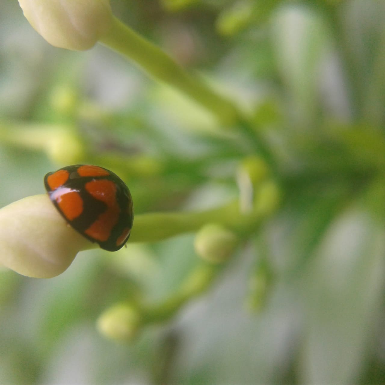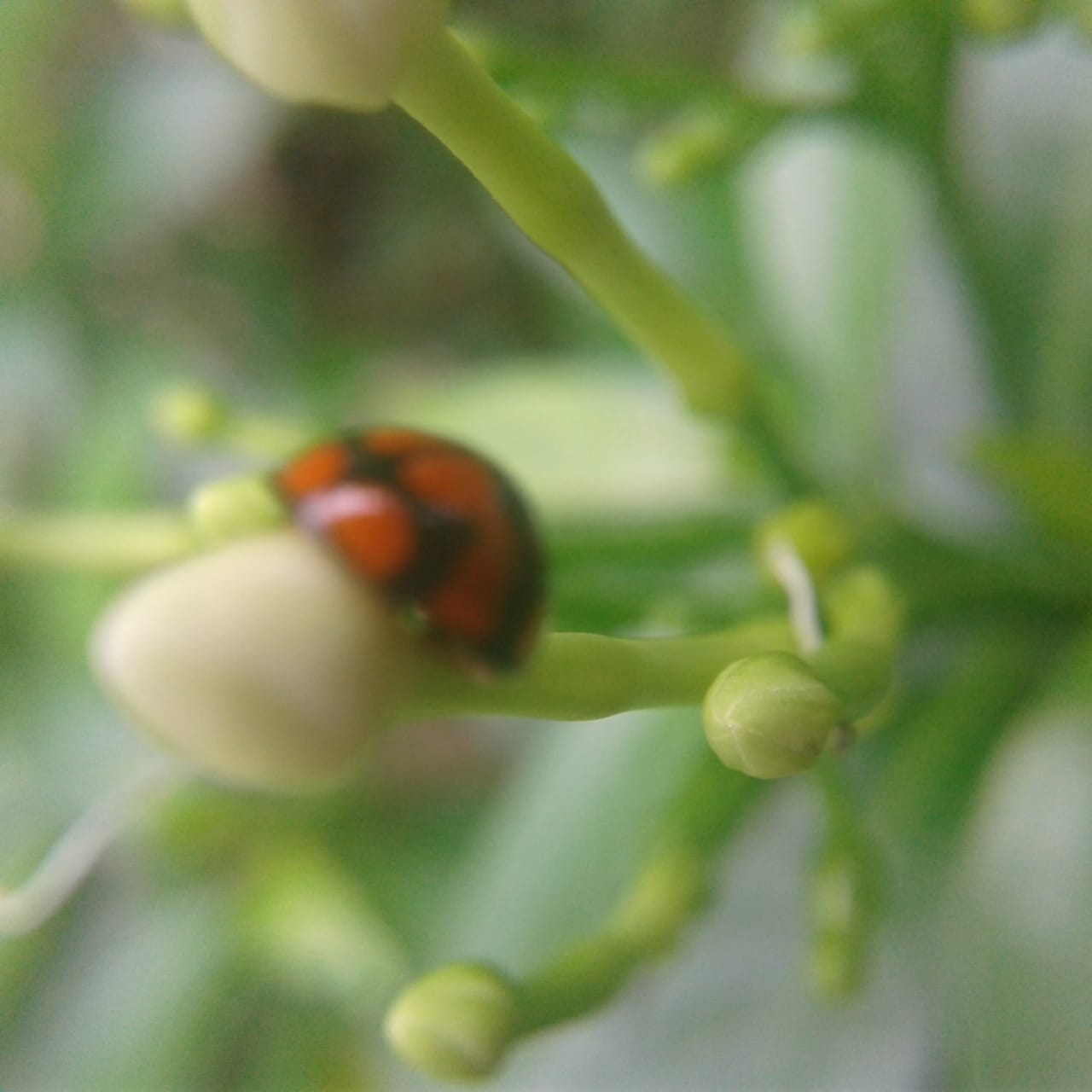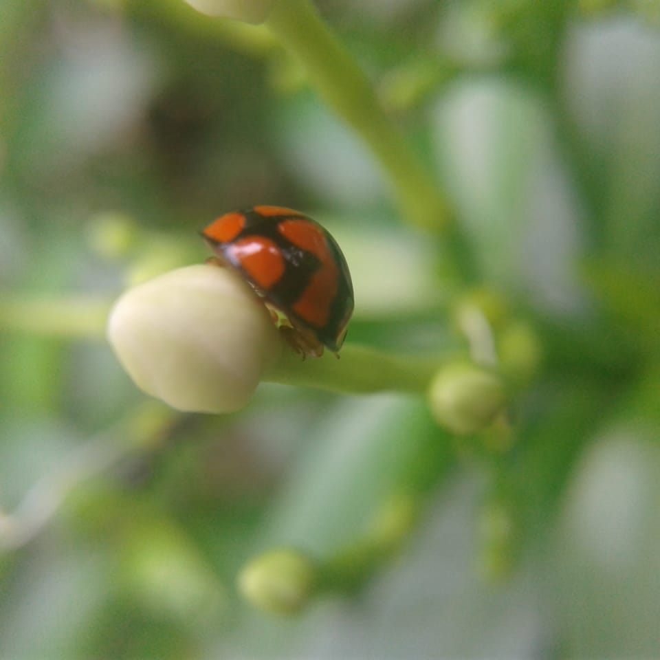 Kumbang lady bird yang sangat cantik sedang berada di atas bakal bunga. Hewan yang berbentuk setengah bola ini berwarna merah mencolok.