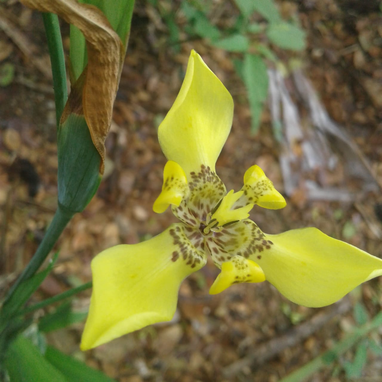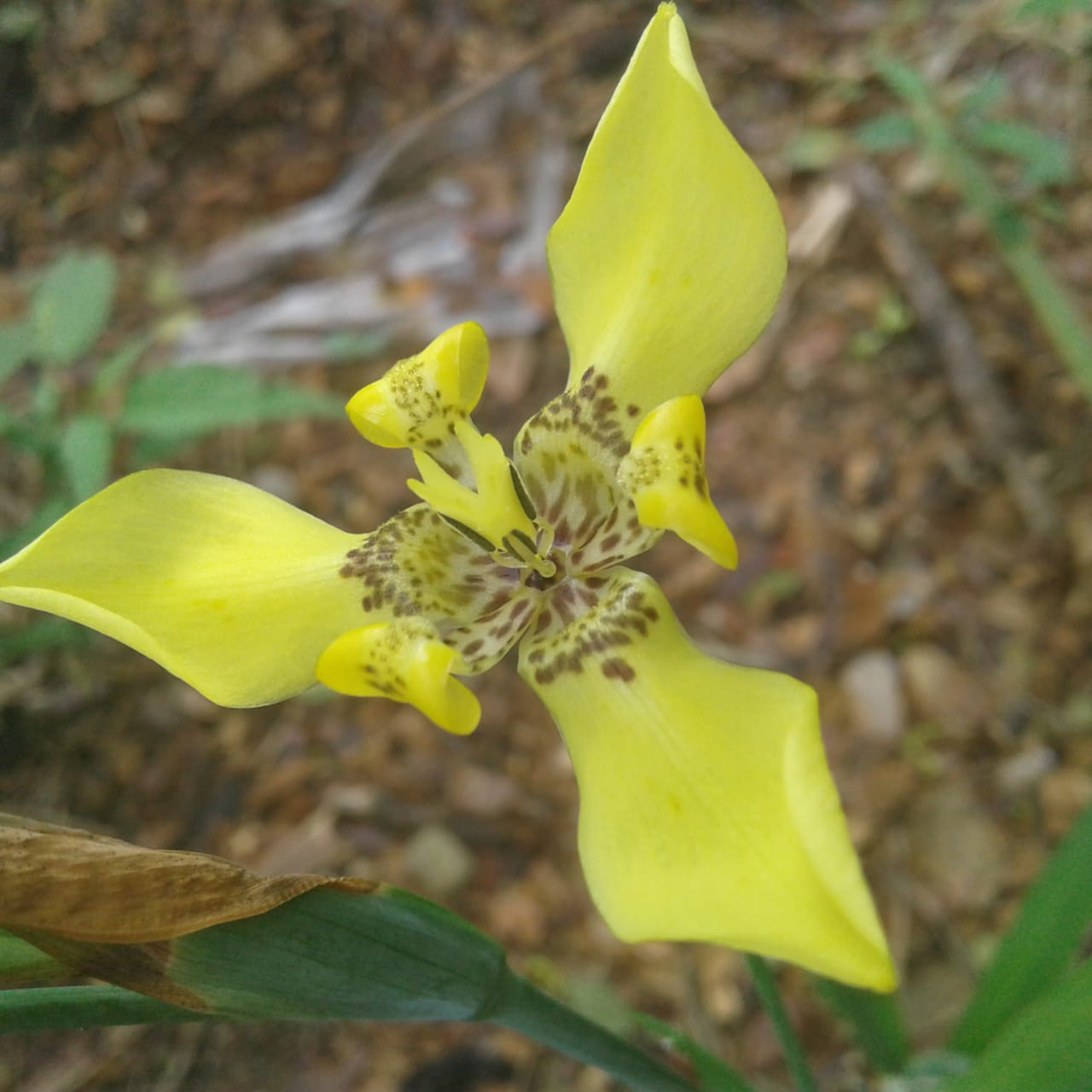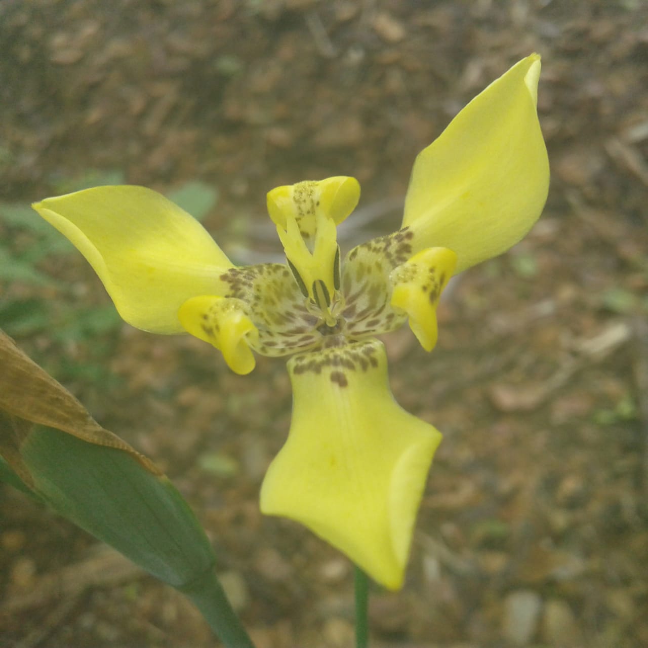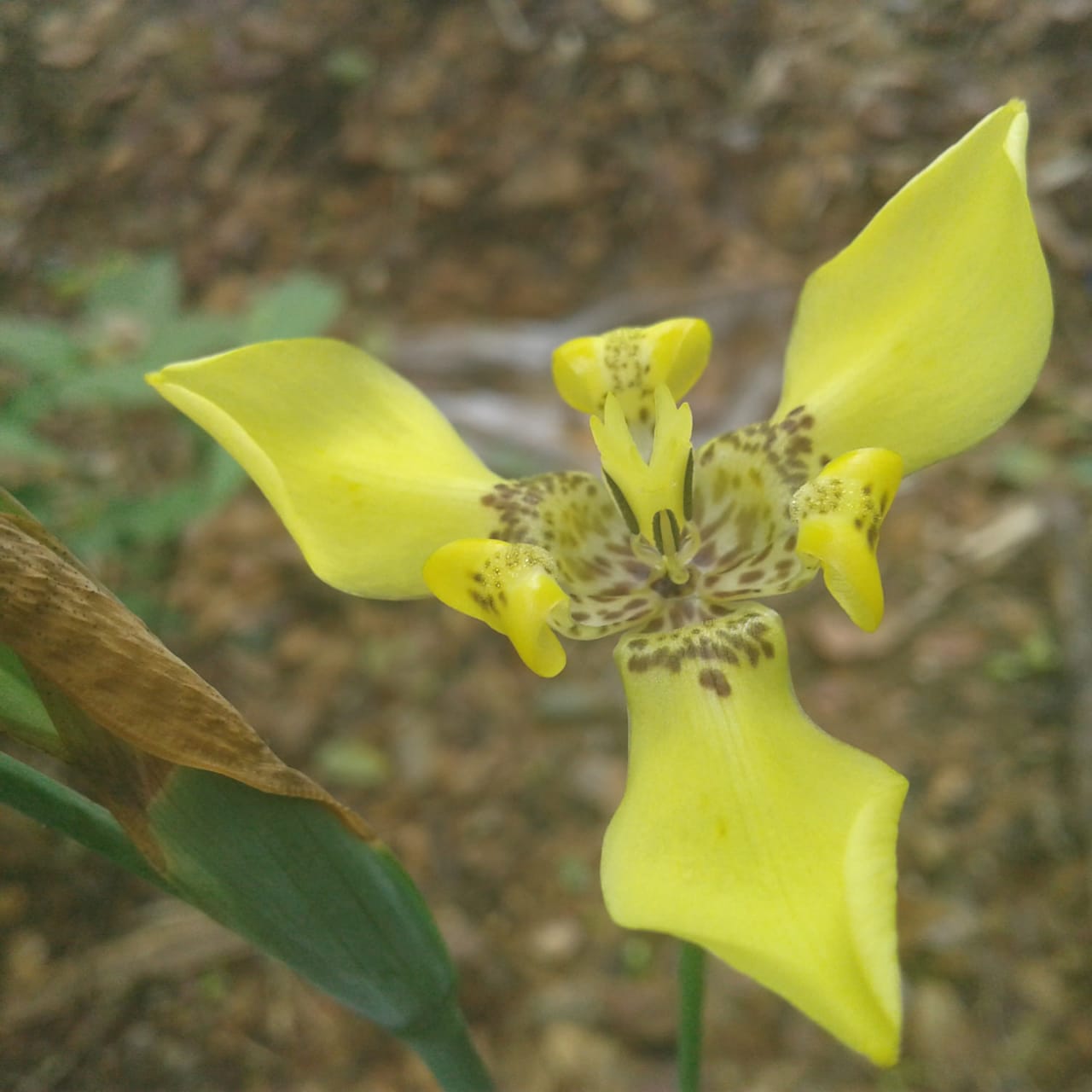 Bunga kuning ini terdiri dari tiga helai daun mahkota bunga. Warnanya kuning cemerlang. Di bagian tengah bunganya terdapat spot warna coklat yang menawan.
