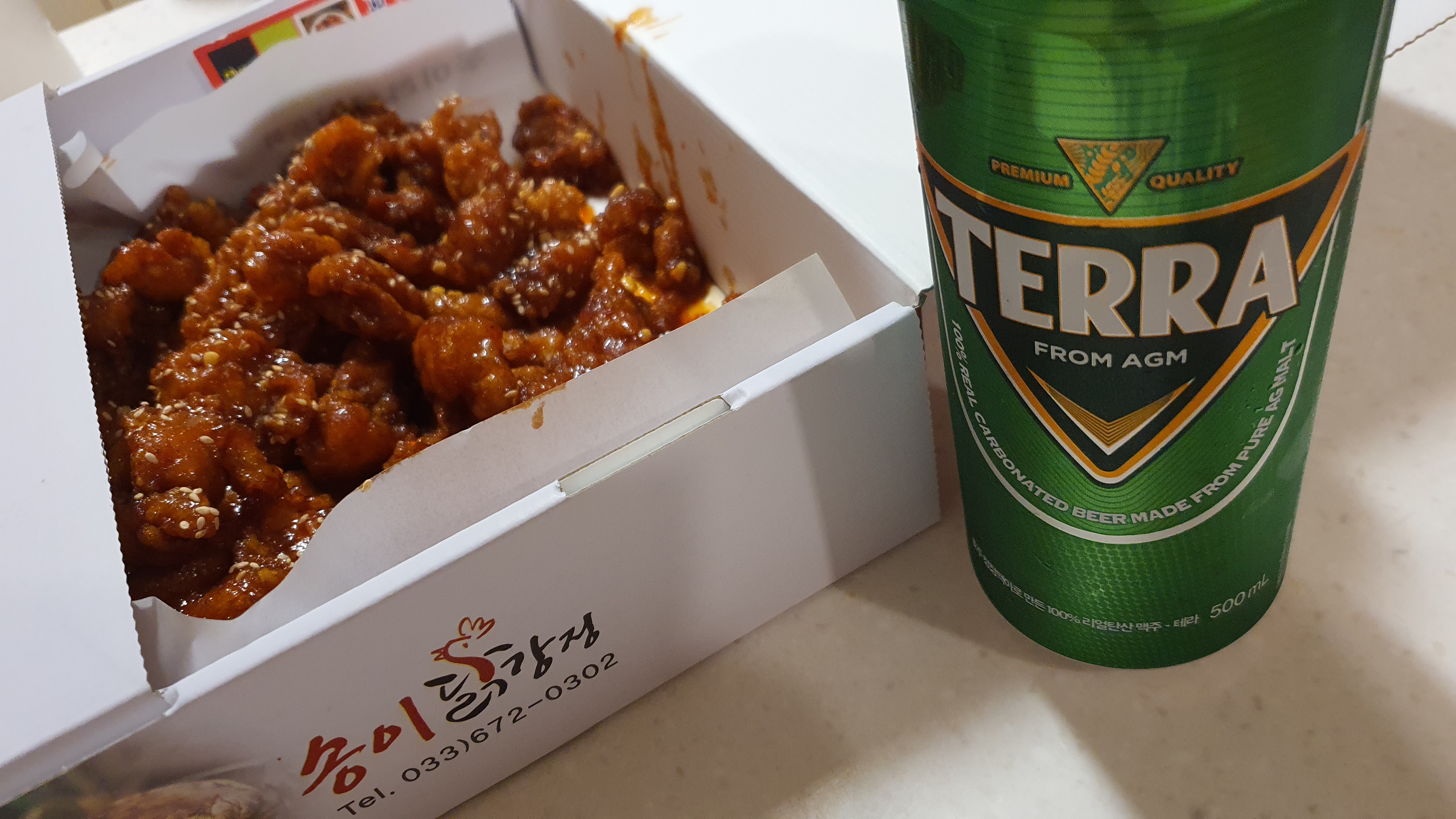동생과 닭강정과 맥주를 거하게 먹으며