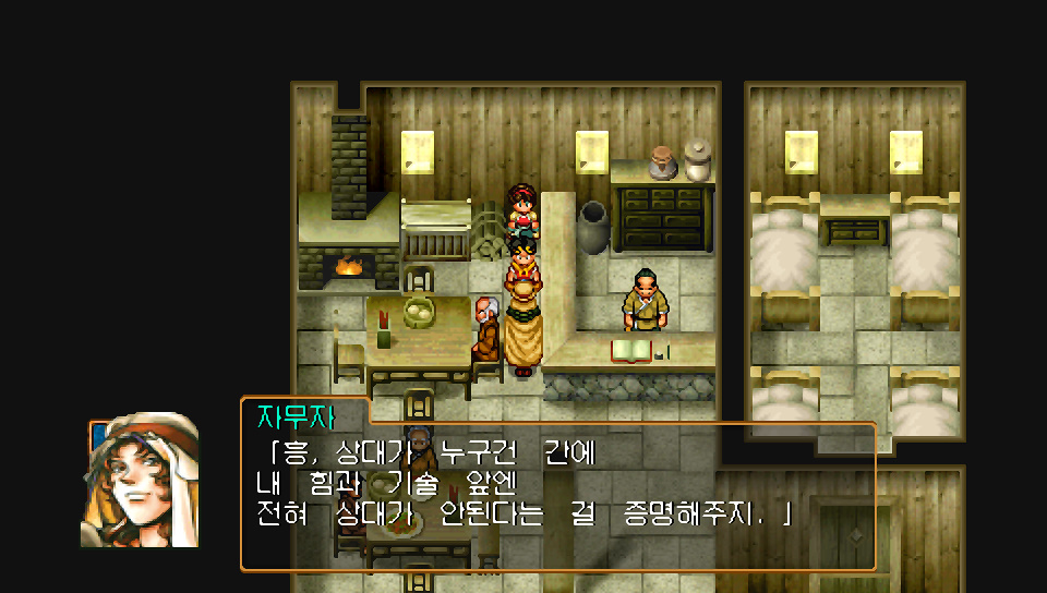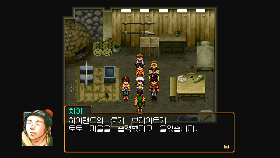 챠이 : "화염창" ...인가요. 하이랜드의 루카 브라이트가 토토 마을을 습격했다고 들었습니다. 다시... 전쟁이 일어나겠네요... 준비는 되어있습니다. 언제 불려져도 좋도록 재료들을 구비해 뒀으니까요. 가시죠.