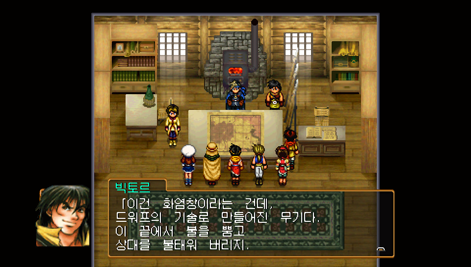 빅토르 : 난, 싸울 사람과 무기를 모아보지. 쓸 수 있는 건 뭐든 써볼 거야. 그래서 말인데, 이걸봐라. 리오우, 죠우이. 이건 화염창이라는 건데, 드워프의 기술로 만들어진 무기다. 이 끝에서 불을 뿜고 상대를 불태워 버리지. 이 화염창이 창고에 몇자루 있어서 그걸 쓴다면 전력에 보탬이 되겠지만, 전부 녹이 슬어버려서 쓸 수가 없어.