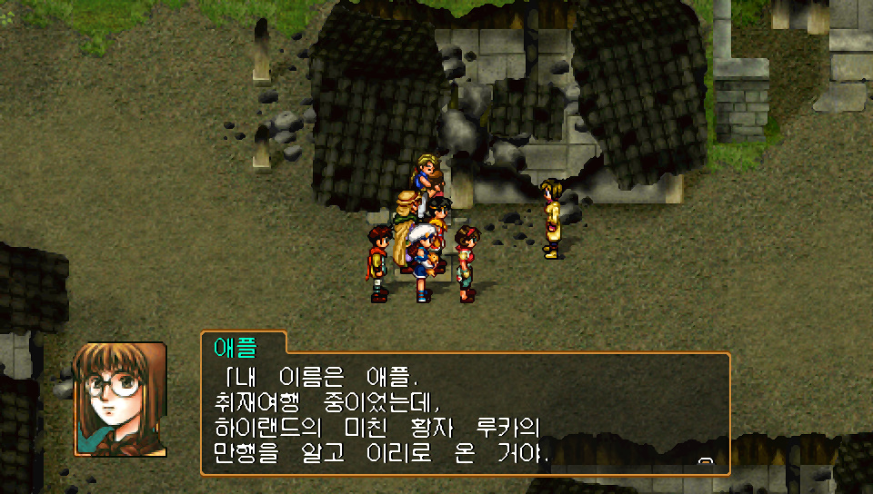 애플 : 내 이름은 애플. 취재여행 중이었는데, 하이랜드의 미친 황자 루카의 만행을 알고 이리로 온 거야. 루카는 이 마을 다음으로... 너, 빅토르라는 사람을 아니? 이 부근에서 용병일을 한다던데, 알고 있지? 시간이 없어. 그리로 안내해줄래?
