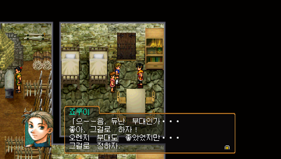 죠우이 : 리오우야? 겨우 잠들었어... 그렇게 울더니... 리오우... 우리들은 어느 쪽에 서야 좋을까... 나는 하이랜드가 조국이라고 생각했어. 그런 조국에 쫓겨서 여기까지 왔지. 그래도 언젠가는, 하이랜드로 돌아갈 수 있을 줄 알았어. 유니콘 부대의 전멸, 라우드 대장의 일, 불탄 토토 마을, 피리카의 눈물. 난... 우린 무엇을 믿어야...